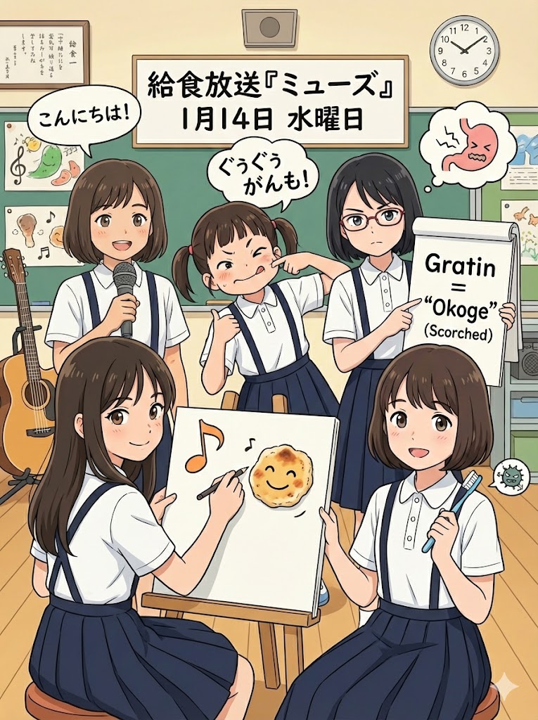Kさん(司会):「1月14日、水曜日! 給食放送『ミューズ』の時間です。この放送は、私たちが食事を科学的に楽しみ、心も体も元気になるための番組です。司会は、私、4年生のKと!」